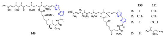 Three 25-membered macrolides consisted of two consecutive oxazole rings, kabiramide I (149) (Scheme 11), halishigamide B (150) and mycalolide D (151), were respectively isolated from the Thai sponge Pachastrissa nux, the Okinawan Halichondria sp., and the stony coral Tubastrea faulkneri, of which compound 150 had a weak cytotoxicity against L1210 and a modest antifungal effect on T. mentagrophytes, while 151 showed a modest general cytotoxicity with average LC50 values of 0.6 µM against the NCI’s 60-human tumor cell line [110,111,112].