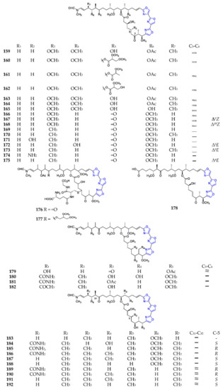 Mycalolides A–C (159–161) (Scheme 13) and their derivatives (162–165, 176, 177, 179) were obtained from a marine sponge of the genus Mycale, except mycalolide E (166) from the coral Tubastrea faulkneri, of which 176 and 177 possessed one sulfur atom connected to the glutathionyl group (i-Glu-Cys-Gly) at C-5 [116]. Bioassay revealed that these substances exhibited excellent cytotoxicities [117]. Phytochemical analysis of sponges Halichondria sp., Jaspis sp., Chondrosia corticata and nudibranch Hexabranchus sanguineus resulted in the discovery of thirteen halichondramides (166–181, 183, 184), which had significant antifungal and cytotoxic effects [111,118]. Kabiramides (180–182, 185–192) were discovered in the Hexabranchus egg masses and the sponge Pachastrissa nux, and displayed extraordinary cytotoxicities, and antiplasmodial and antifungal activities [119].