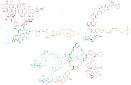 Within this framework, we developed various molecular devices programmed for the selective delivery of anticancer drugs (Figure 2). These functional systems were designed to allow: (1) the transport in the body of potent anticancer agents in an innocuous manner toward safe tissues, (2) the efficient recognition of malignant specificities located either at the surface of cancer cells or in the tumor microenvironment, and (3) the controlled release of the parent drug exclusively at the tumor site. Such compounds include programming components such as self-immolative linkers, chemical amplifiers, self-opening macrocycles, enzyme-responsive biorthogonal triggers, and so on, which pilot the process of drug release in a stringently controlled fashion [,,,,,,,,].