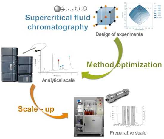 Supercritical fluid chromatography (SFC) nowadays mostly relates to a chromatographic separation technique where the mobile phase is composed of pressurized carbon dioxide and a co-solvent. Chiral SFC has been largely employed for two decades in pharmaceutical industries, especially for its economic and ecological advantages at the preparative scale []. Achiral SFC, however, was not so frequently used, up until recent years. The introduction, by several manufacturers, of analytical SFC instruments that are better fitting to current expectations of chromatographers has significantly contributed to a renewed interest in this most versatile technique (Figure 3).