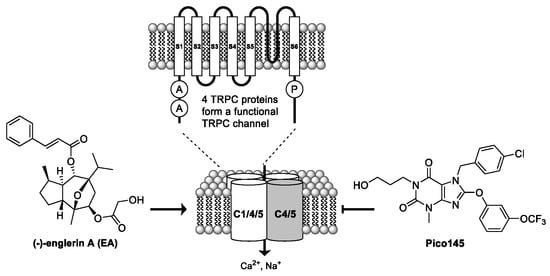Currently, the best TRPC1/4/5 activator is the natural product (-)-englerin A (EA) (Figure 4). The best inhibitors are xanthines, such as Pico145, which can be used in cells, tissues, and animals, and distinguishes between different TRPC1/4/5 tetramers []. The mechanisms by which EA and xanthines modulate TRPC1/4/5 channels—and can distinguish between closely related channels—is not known.