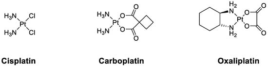 Structures of cisplatin, oxaliplatin, and carboplatin.