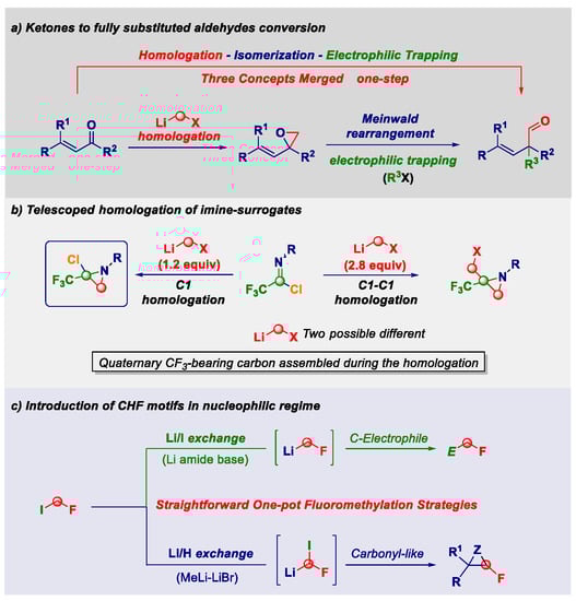 The direct transfer of a reactive nucleophilic CH2X unit into an existing linkage enables the formal introduction of the moiety with a precisely defined degree of functionalization [,]. Upon the fine-tuning of the reaction conditions governing the transformation, the initial homologation event can serve as the manifold for triggering unusual rearrangement sequences leading to complex architectures through a unique synthetic operation. The direct/full chemoselective conversion of a ketone into the homologated all-carbon quaternary aldehyde (Figure 6a) [] and the telescoped homologation of imine surrogates to quaternary aziridines (Figure 6b) [] will illustrate these unprecedented concepts. Additionally, the one-step mono-fluoromethylation of carbon electrophiles with extremely labile fluoromethyllithium reagents will provide a novel entry to valuable fluorinated building-blocks without the need to use protecting elements for fluoro-containing carbanions (Figure 6c) [,,]. Moreover, novel strategies for introducing the difluoromethyl group through the proper activation of commercially available TMSCHF2 with an alkoxide will be discussed [,].