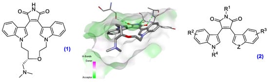 Protein kinases are a class of regulatory enzymes and are ubiquitous within the human body. These enzymes are responsible for the modification of protein function through phosphorylation of target substrates, which have important downstream effects in intracellular signaling pathways []. Overexpression of particular kinases, including glycogen synthase kinase-3 (GSK-3), has been implicated in cancer and a number of neurological disease states including bipolar disorder and Alzheimer’s. This discovery of staurosporine propagated the design of 38 FDA approved kinase inhibitors, including the protein kinase C (PKC) inhibitor ruboxistaurin (1) (Figure 7) designed by Eli Lilly and Ro 318220, a nanomolar inhibitor of PKC and GSK-3β []. Crystal structures of this bisindolylmaleimide (BIM) framework identified that the maleimide headgroup (R1 = H) induces strong hydrogen bond interactions, with the hinge of amino acids locking it in place, and adopts the conformation represented in Figure 7 within the kinase pocket.