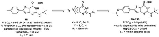 Malaria is a parasitic infection caused by Plasmodium that affected 229 million people and killed approximately 409,000 in 2019, according to the WHO []. The discovery of new antimalarial compounds is necessary to tackle the spread of artemisinin-resistant Plasmodium falciparum strains []. In this context, we identified M1, a lead compound belonging to the 2-aminothieno[3,2-d]pyrimidinones series [], showing in vitro multi-stage antiplasmodial activity associated with low cytotoxicity. Moreover, M1 is active against quiescent artemisinin-resistant P. falciparum strain. Unfortunately, M1 is quickly metabolized by mouse liver microsome into inactive derivatives (t1/2 = 11 min), leading to activity loss in vivo in mouse models.