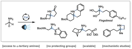 - Ryder, A.S.H.; Cunningham, W.B.; Ballantyne, G.; Mules, T.; Kinsella, A.G.; Turner-Dore, J.; Alder, C.M.; Edwards, L.J.; McKay, B.S.J.; Grayson, M.N.; et al. Photocatalytic α-tertiary amine synthesis via C-H alkylation of unmasked primary amines. Angew. Chem. Int. Ed. 2020, 59, 14986–14991. [Google Scholar] [CrossRef]