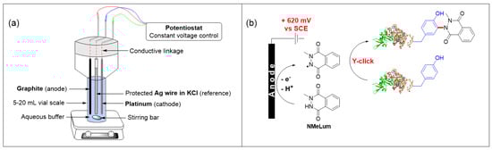 - Alvarez-Dorta, D.; Thobie-Gautier, D.C.; Croyal, M.; Bouzelha, M.; Mevel, M.; Deniaud, D.; Boujtita, M.; Gouin, S.G. Electrochemically promoted tyrosine-click-chemistry for protein labeling. J. Am. Chem. Soc. 2018, 140, 17120–17126. [Google Scholar] [CrossRef]