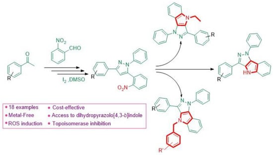 - Kaur, M.; Mehta, V.; Wani, A.A.; Arora, S.; Bharatam, V.P.; Sharon, A.; Singh, S.; Kumar, R. Synthesis of 1,4-dihydropyrazolo[4,3-b]indoles via intramolecular C(sp2)-N bond formation involving nitrene insertion, DFT study and their anticancer assessment. Bioorg. Chem. 2021, 114, 105114. [Google Scholar] [CrossRef] [PubMed]