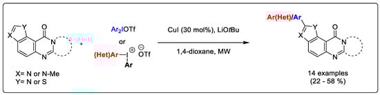 - Kumar, D.; Pilania, M.; Arun, V.; Pooniya, S. C–H arylation of azaheterocycles: A direct ligand-free and Cu-catalyzed approach using diaryliodonium salts. Org. Biomol. Chem. 2014, 12, 6340–6344. [Google Scholar] [CrossRef]