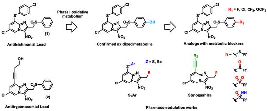 - Fersing, C.; Basmaciyan, L.; Boudot, C.; Pedron, J.; Hutter, S.; Cohen, A.; Castera-Ducros, C.; Primas, N.; Laget, M.; Casanova, M.; et al. Nongenotoxic 3-nitroimidazo[1,2-a]pyridines are NTR1 substrates that display potent in vitro antileishmanial activity. ACS Med. Chem. Lett. 2019, 10, 34–39. [Google Scholar] [CrossRef] [PubMed]