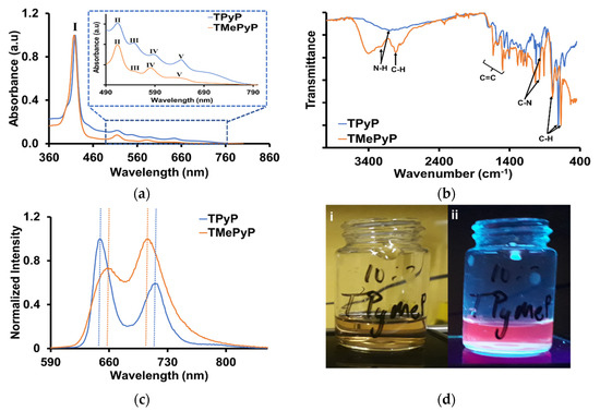 (a) UV-Vis spectra of TPyP and TMePyP with enlarged UV-Vis spectra. (b) FTIR spectra of TPyP and TMePyP. (c) Normalized PL spectra of TPyP and TMePyP excitation of 415 nm. (d) Images of TMePyP under normal light (i) and UV-light irradiation (ii).