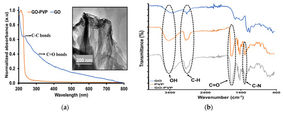 GO was prepared using the Hummers method and then modified with PVP to increase the aqueous dispersibility [37,38]. The UV spectrum of the as-synthesized GO (Figure 2a) showed small shoulder peaks corresponding to π-π* carbon-carbon and n-π* oxygen-carbon transitions [39]. When GO was modified with PVP, the π-π* and n-π* of GO disappeared, indicating the interaction of PVP with GO. To further prove this, FTIR spectra of GO, PVP and GO-PVP were analyzed, which demonstrated that PVP chains have completely masked GO sheet surface. This could be attributed to the fact that PVP and GO-PVP vibrations are similar, with both spectra showing two stretched peaks at 1670 and 1283 cm−1 corresponding to C=O and C–N of PVP, respectively (Figure 2b). The TEM image of GO-PVP inserted in Figure 2a portrayed a 2-dimensional sheet of GO.