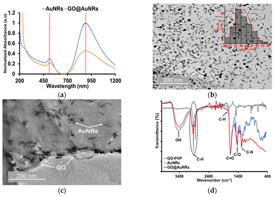 (a) UV-Vis spectra of AuNRs and GO@AuNRs. TEM image of (b) AuNRs with corresponding length distribution histogram and (c) GO@AuNRs (scale: 200 nm). (d) FTIR of GO-PVP, AuNRs and GO@AuNRs.
