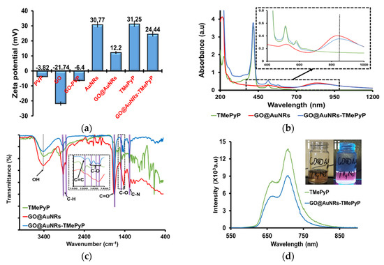 The zeta potential of PVP, GO, modified GO demonstrated a potential change from −22.74 for GO to −6.40 mV after modification with PVP (Figure 4a). Moreover, after incorporating positively charged AuNRs (+30.77 mV) on the partially negative charge modified GO, the potential changed to +12.20 mV due to the interaction between modified GO and AuNRs. When a water-soluble porphyrin (TMePyP) was anchored on the GO@AuNRs nanocomposite, the potential increased to +24.44 mV due to the cationic charge of TMePyP. The UV-Vis-NIR spectrum of GO@AuNRs-TMePyP in Figure 4b shows both peaks of AuNRs and porphyrin. However, the LSPR peak of AuNRs in GO@AuNRs-TMePyP was red-shifted by 20 nm. The TSPR of AuNRs merged with the Q-bands of porphyrin. Figure 4c shows the FTIR spectrum of GO@AuNRs-TMePyP, which exhibits most of the GO@AuNRs bands such as OH broadband, C=O and C-O stretching vibration at ~3424 cm−1, ~1667 cm−1 and ~1240 cm−1, respectively. The alkyl C-H bands of AuNRs at ~2850 and ~2918 cm−1 became sharper in the nanocomposite due to the porphyrin alkyl C-H bands. The porphyrin peaks at 1494 cm−1 and 1291 cm−1 due to their C=C and C-N stretching can also be seen in the GO@AuNRs-TMePyP spectrum. These results indicate the formation of GO@AuNRs-TMePyP nanocomposite.