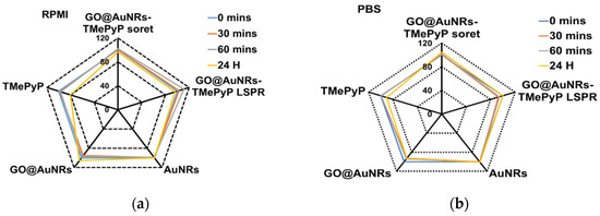 The colloidal stability of nanomaterials is one the most important characterizations for their biological applications. This helps to understand the nanomaterial’s physicochemical properties when they interact with the complex biological media comprising of electrolytes proteins, lipids and many more [44]. Stability of AuNRs, GO@AuNRs, TMePyP and GO@AuNRs-TMePyP in the supplemented culture medium RPMI (Figure 6a) and PBS (Figure 6b) at a volume ratio of 1:10 (sample:medium) was evaluated against time. The AuNRs, GO@AuNRs and GO@AuNRs-TMePyP were found to be highly stable (above 90%) for 24 h in RPMI medium. On the other hand, the TMePyP sample showed stability slightly above 80% in the RPMI medium after 24 h. However, when the samples were dispersed in PBS, all of them showed stability above 90% after 24 h. GO@AuNRs-TMePyP nanocomposite was more stable than the bare TMePyP in PBS. The stability of GO@AuNRs-TMePyP nanocomposite is attributed to the modified GO as it has been reported that GO prevents the protein from absorbing in the physiological environments [45].