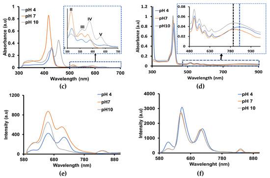 The effect of pH on the stability of TMePyP and GO@AuNRs-TMePyP was carried out at different buffer solutions with pH 4, 7 and 10. It is seen in the UV-Vis spectrum (Figure 6c) that the Soret band and Q bands (II, III and IV) were red-shifted to 430 nm, 517 nm, 592.5 and 649 nm, respectively, in the acidic medium, which could be due to protonation. In an alkaline medium, the TMePyP was deprotonated, the Soret band on the UV-Vis spectrum red-shifted, showing two soret peaks at 430 and 458 nm, while the Q-bands IV and V became more pronounced with a slight red-shifting to 590 nm and blue-shifting to 633 nm, respectively [46]. In addition, the Q band II absorbance decreased. The UV-Vis spectrum (Figure 6d) of GO@AuNRs-TMePyP maintained the soret and Q bands without significant changes in the spectra. In Figure 6e, the photoluminescent measurements of TMePyP showed similar patterns compared with its UV-Vis spectrum (Figure 6c), with weak emission peaks in both acidic and alkaline pHs. However, PL spectra of GO@AuNRs-TMePyP (Figure 6f) showed a similar pattern in all the pHs. These results confirmed the strong protection of TMePyP by GO@AuNRs, and hence it is not greatly affected by pH changes.