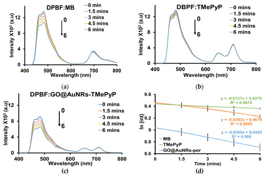 PL emission spectra of (a) DPBF:MB, (b) DPBF:TMePyP and (c) DPBF:GO@AuNRs-TMePyP excited at 560 nm for 6 min at the intervals of 1.5 min. (d) Integrated emission intensity time graph of DPBF at 471 nm after mixing with MB, TMePyP and GO@AuNRs-TMePyP and irradiated radiated at 560 nm for different time intervals 6.