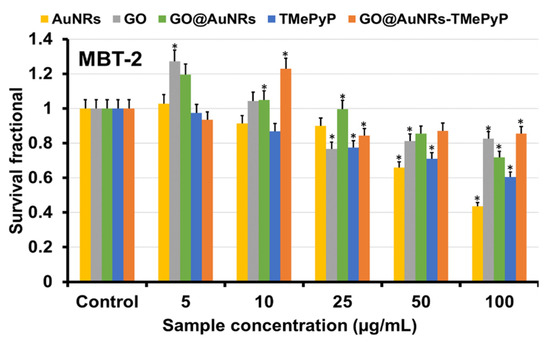 Cell viability of GO, AuNRs, GO@AuNRs, TMePyP and GO@AuNRs-TMePyP against MBT-2 cells (* p < 0.05).