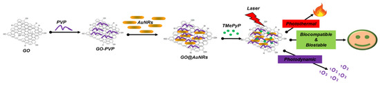 AuNRs can be easily tuned to absorb in different NIR ranges (650–1100 nm) [7]; however, most AuNRs are prone to induce toxicity when used in biological applications. Researchers have used different coating materials, such as polymers [8,9,10,11,12,13,14,15,16], biomolecules [17,18,19] and graphene-based materials [15,20,21,22,23], to reduce the toxicity of AuNRs. Among them, graphene-based AuNRs are more effective as they reduce toxicity and simultaneously increase their photothermal efficiency [15,20,21,22,23]. AuNRs have also been investigated for photo synergistic therapy using different photosensitisers such as chlorin e6 [5,24,25], phthalocyanine [26], rose Bengal [27], indocyanine green [28], 5,10,15,20-tetrakis(N-methylpyridinium-4-yl)porphyrin tosylate salt [29], pheophorbide a [30] and sulfonated aluminium phthalocyanines [31]. The combination of AuNRs and photosensitizers could yield a synergistic photothermal and photodynamic system.