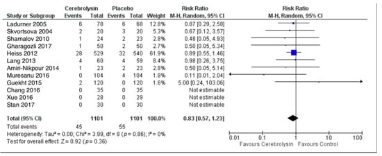 - Bornstein, N.M.; Guekht, A.; Vester, J.; Heiss, W.-D.; Gusev, E.; Hömberg, V.; Rahlfs, V.W.; Bajenaru, O.; Popescu, B.O.; Muresanu, D. Safety and Efficacy of Cerebrolysin in Early Post-Stroke Recovery: A Meta-Analysis of Nine Randomized Clinical Trials. Neurol. Sci. 2018, 39, 629–640. [Google Scholar] [CrossRef] [Green Version]