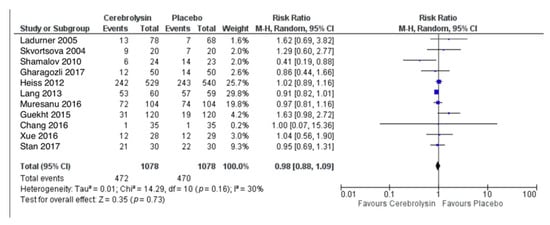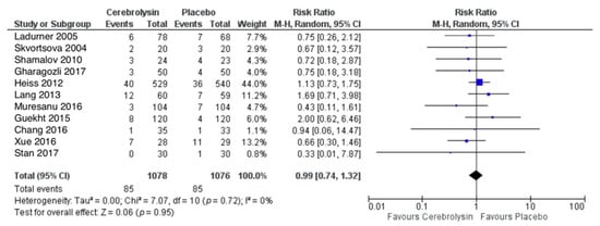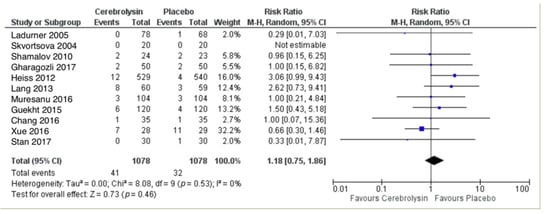 AE were reported in a total of 472 out of 1078 subjects treated with Cerebrolysin (43.8%), as compared to 470 out of 1078 subjects treated with placebo (43.6%). The combined RR for patients with at least one AE showed no difference between the groups (RR = 0.98, 95%CI = 0.88 to 1.09, p = 0.73, random effects model, Figure 4).