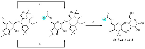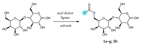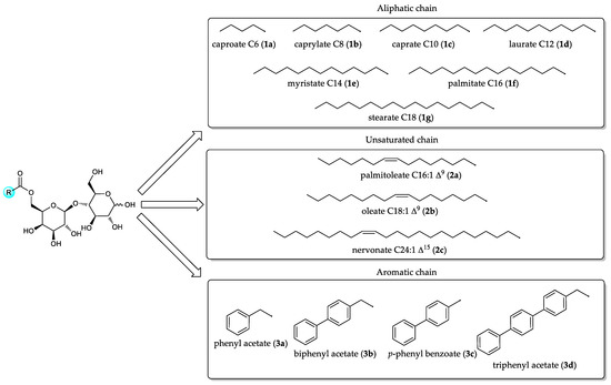 The known 6′-O-acyl(aryl)lactose esters are obtained from various aliphatic fatty acids (saturated, unsaturated) or aromatic acids and are represented in Figure 2.