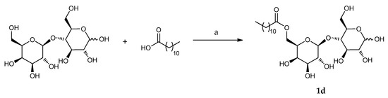Lucarini et al. have synthetized a series of 6′-lactose esters by a two-step procedure (Scheme 3) starting from lactose tetra acetal (LTA) coupled with the opportune aliphatic poly(un)saturated fatty acids or aromatic acids. Lactose aliphatic and poly(un)saturated esters were obtained by enzymatic esterification using Lipozyme® (pathway “a”), followed by acidic deprotection [17,18,19,20]. On the other hand, 6′-lactose aromatic esters were synthesized using acyl chlorides with a classic esterification method (pathway “b”) because lipases do not tolerate aromatic acid substrates [20]. Notably, neither 2′-lactose aromatic esters nor diester derivatives were produced by that chemical esterification.