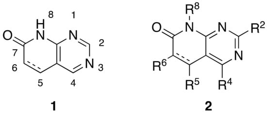 Pyrido[2,3-d]pyrimidin-7(8H)-ones 1 are ortho-fused bicyclic heterocycles consisting of pyridone and pyrimidine rings. This kind of structure presents up to five diversity centers (R2, R4, R5, R6, and R8) and two possible degrees of unsaturation between C5 and C6 (Figure 1). Functionalized pyrido[2,3-d]pyrimidines 2 are considered privileged heterocyclic scaffolds for drug discovery due to their well-known activity as tyrosine kinase inhibitors (TKI) [5,6]. In this context, our group has previously synthesized multiple compounds with activities in the nanomolar range as BCR inhibitors for B lymphoid malignancies or DDR2 inhibitors for the treatment of lung cancer, among others [7].