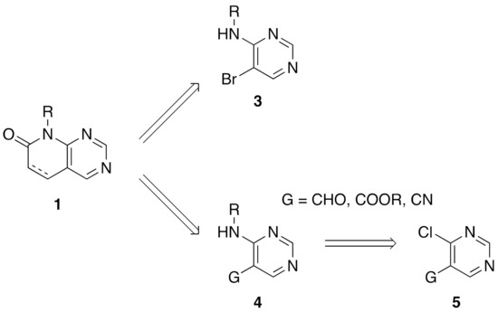 From a synthetic point of view, most of the research groups currently working with such a scaffold construct the molecule either from a preformed pyrimidine or from a preformed pyridone ring. In the first strategy, two approaches have been described to synthesize a pyrido[2,3-d]pyrimidin-7(8H)-one 1: starting from an adequately substituted 4-amino-5-bromopyrimidine 3 or starting from an N-substituted pyrimidine-4-amine 4, which contains a carbon functional group G (CHO, COOR, or CN) at position C5 of the pyrimidine ring. This latter compound is usually obtained from the corresponding 4-chloro-substituted pyrimidine 5 (Figure 2) [8].