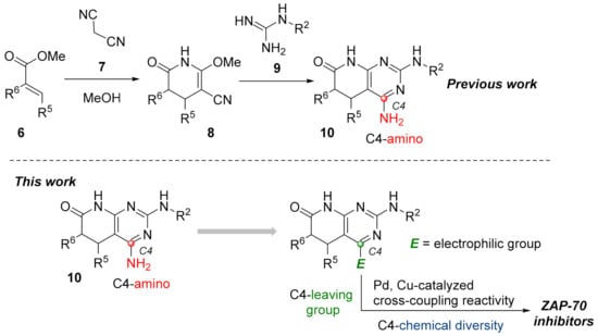 Such limited chemical diversity and the need to explore new tyrosine kinase targets taking advantage of our methodology impelled us to study the introduction of new substituents at C4 to evaluate the potential biological activity of the resulting derivatives on ZAP-70. Hence, and given the great impact that transition metal-catalyzed coupling reactivity have demonstrated in the synthesis of pharmaceuticals [12], we sought the introduction of an electrophilic manifold at the C4 position capable of engaging in either Pd and/or Cu cross-coupling reactions as a key point to rapidly enlarge the number of possible substitutions at such a position (Figure 3 right).