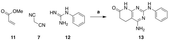 Synthesis of 4-amino-2-(phenylamino)-5,6-dihydropyrido[2,3-d]pyrimidin-7(8H)-one (13). Reaction conditions (a): MW (10 min, 140 °C), dry methanol.
