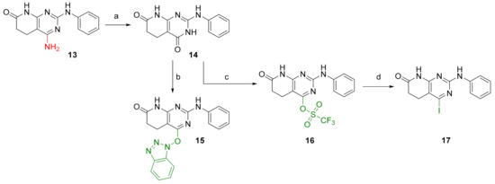 Once 14 was obtained, it was possible to introduce either a benzotriazole group (BOP) to afford 4-((1H-benzo[d][1,2,3]triazol-1-yl)oxy)-2-(phenylamino)-5,6-dihydropyrido[2,3-d]pyrimidin-7(8H)-one (15) or a triflate group (OTf), affording 7-oxo-2-(phenylamino)-5,6,7,8-tetrahydropyrido[2,3-d]pyrimidin-4-yl trifluoromethanesulfonate (16), with both reactions having yields above 90% (Figure 5). Finally, an iodine atom can also be introduced via nucleophilic substitution of the triflate group with NaI. In this way, 4-iodo-2-(phenylamino)-5,6-dihydropyrido[2,3-d]pyrimidin-7(8H)-one (17) can be obtained in a 95% yield. On the basis of these structures, holding diverse leaving groups, we were able to synthesize, describe, characterize, and test the biological activity of several new compounds.