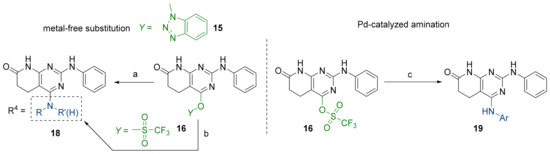 Regarding the synthesis of compounds with N-aryl bonds at the C4 position, we used the Buchwald–Hartwig cross-coupling reaction on compound 16. In particular, the variant of this reaction that uses OTf as a leaving group for the N-arylation [16] was demonstrated to be quite efficient in providing yields of the corresponding amines that oscillate between 72 and 97% (Table 2). The full account of our 4-arylamino-2-(phenylamino)-5,6-dihydropyrido[2,3-d]pyrimidin-7(8H)-ones (19) synthesized by direct palladium-catalyzed coupling of aryl triflates and anilines is included in Table 2.