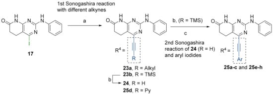 Finally, we explored the possibility of introducing a triple bond at the C4 position because they play an important functional moiety in a wide range of biologically active compounds [18]. With the aim of lending the Sonogashira reaction a higher degree of modularity, we considered that it would be a good idea to gain access to a common terminal alkyne intermediate of type of 24. In turn, this approach would allow the generation of a wider variety of structures just by carrying out a second Sonogashira coupling with 24 and different aryl iodides, which are generally more accessible and cheaper than ethynylaryl compounds. On this basis, we synthesized the 2-(phenylamino)-4-((trimethylsilyl)ethynyl)-5,6-dihydropyrido[2,3-d]pyrimidin-7(8H)-one (23b) and proceeded to the efficient deprotection of the trimethylsilyl group using a 1 M TBAF/THF solution [19]. Once the 4-ethynyl-2-(phenylamino)-5,6-dihydropyrido[2,3-d]pyrimidin-7(8H)-one (24) was obtained, a second Sonogashira reaction was accomplished, but this time using the pyrido[2,3-d]pyrimidine as a limiting reagent and the aryl iodides as an excess reagent (Figure 8).