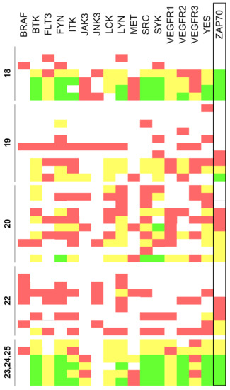 Residual activity percentages at a concentration of 10 µM of the tested compounds (<20% in green, 20–60% yellow, 60–80% red, and >80% white). Results are classified according to the corresponding family of compounds (18, 19, 20, 22 and 23, 24, 25).