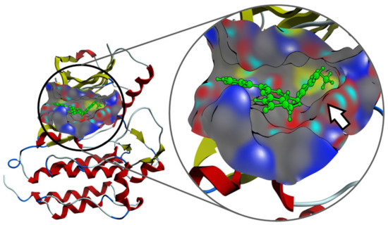 Interaction mechanism between one of the compounds with C4 substitution and the pocket of the ZAP-70 protein, predicted by molecular docking. The presence of the C4 substituent clearly allows the molecule to improve the binding on the active site (white arrow).
