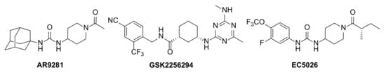 Soluble epoxide hydrolase (sEH, EPHX2, EC 3.3.2.3) metabolizes epoxyeicosatrienoic acids (EETs), potent endogenous anti-inflammatory mediators [,,], into the corresponding dihydroxyeicosatrienoic acids, which are much less biologically active [,]. It is now well established that sEH pharmacological inhibition in vivo stabilizes the concentration of EETs and other epoxy fatty acids, reducing pain and inflammatory states, suggesting sEH as a potential pharmacological target for the treatment of a variety of inflammatory diseases [,,]. Indeed, several sEH inhibitors (sEHI) have reached clinical trials: AR9281, developed by Arête Therapeutics for the treatment of hypertension in diabetic patients []; GSK2256294, developed by GlaxoSmithKline for chronic obstructive pulmonary disease [] and aneurysmal subarachnoid hemorrhage []; and EC5026, developed by EicOsis, which has recently successfully finished Phase 1a clinical trials for the treatment of neuropathic pain [,] (Figure 1).