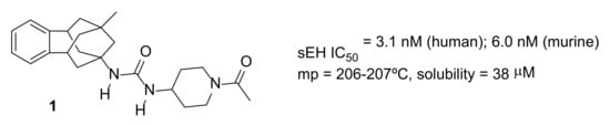 Taking into account that several adamantane-based and benzene-based ureas are endowed with very potent activity as sEHI [,,,], that both AR9281 and EC5026 feature an acylpiperidine unit, and that the highly hydrophobic pocket of sEH seems able to accommodate very large hydrophobic groups [], we have recently designed, synthesized and pharmacologically evaluated a novel series of ureas featuring the benzohomoadamantane scaffold as hydrophobic moiety, that merges in its polycyclic structure an adamantane-related core with an aromatic ring []. Several of these novel sEHI-based ureas were low nanomolar inhibitors of the human and murine sEH, but most of them, as 1, showed high melting points, limited solubility, and unacceptably low microsomal stabilities (Figure 2) []. Taking into account that amides are good pharmacophores for sEHI [], the aim of the present study was to replace the urea moiety of 1 by an amide group in order to improve the physical properties and, particularly, its very poor microsomal stability to improve availability and in vivo efficacy.