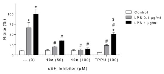 In order to evaluate the ability of the selected 10c in inhibiting the nitric oxide generation by activated glial cells [] we used microglial BV2 cells activated with LPS. As shown in Figure 3, treatment with LPS led to an increased release of nitric oxide as indicated by the analysis of nitrite levels in the conditioned media. Gratifyingly, co-incubation with 10c completely inhibited the pro-inflammatory effects of LPS. Statistical comparison of means showed that 10c at 50 µM or 100 µM reduced nitric oxide generation to levels indistinguishable from control levels despite the presence of LPS. In contrast, the reference compound TPPU was less effective and only partially inhibited LPS effects. TPPU at 100 µM reduced the nitric oxide release induced by LPS to approximately 50%, which was significantly higher than control wells. Notably, the statistical comparison of nitrite levels between both sEHI compounds showed significantly higher protection by 10c than TPPU against inflammatory cell injury by 1 µg/mL of LPS.