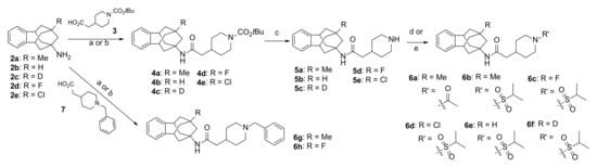 The targeted amides were easily synthesized in low to moderate yields from known benzohomoadamantane amines 2a–e [,,]. The coupling of these amines with carboxylic acids 3 and 7, using either EDC·HCl and HOBt or HATU, provided carbamates 4a–e and amides 6g–h, respectively. Compounds 4a–e were deprotected using HCl in dioxane to give amides 5a–e. Reaction of 5a with acetyl chloride furnished amide 6a. Finally, piperidines 5a–e were reacted with 2-propanesulfonyl chloride to obtain amides 6b–f (Scheme 1).