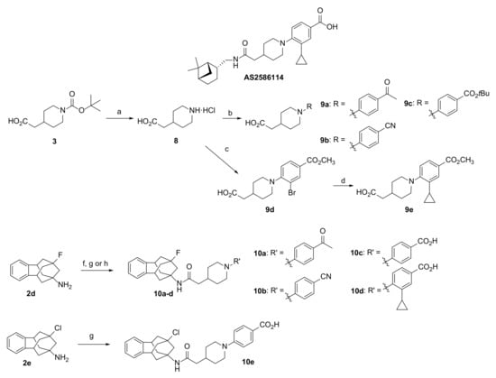 Structure of known AS2586114 and synthesis of novel sEHI 10a–e. (a) HCl/Dioxane 4 M, rt, 2 h; (b) 4-fluoroacetophenone (for 9a), 4-fluorobenzonitrile (for 9b) or t-butyl 4-fluorobenzoate (for 9c), K2CO3, DMSO, 100 °C, overnight; (c) methyl 3-bromo-4-fluorobenzoate, K2CO3, DMF, 100 °C, overnight; (d) cyclopropylboronic acid, Pd(Ph3)4, K3PO4, dioxane, 100 °C, overnight; (f) 9a or 9b, HATU, DIPEA, DMF, rt, overnight; (g) 9c, HATU, DIPEA, DMF, rt, overnight; then HCl/dioxane 4 M, H2O, rt, 2 h. (h) 9e, HATU, DIPEA, DMF, rt, overnight; then methanol, KOH, rt, overnight.