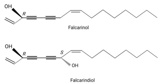 Chemical structures of the polyacetylenes falcarinol [(3R)-heptadeca-1,9(Z)-diene-4,6-diyne-3-ol] and falcarindiol [(3R,8S)-heptadeca-1,9(Z)-diene-4,6-diyne-3,8-diol]. Created with BioRender.com.