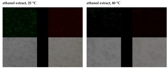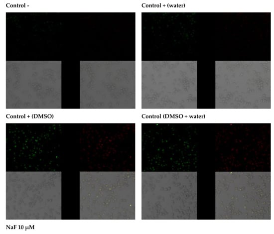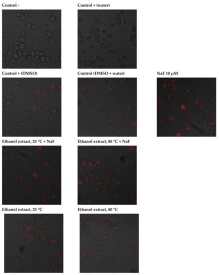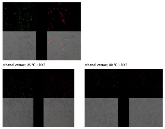 Cells (1 × 105 cells/well) were incubated with fluoride solutions alone or with an ethanol or water extract on microscope slides according to the aforementioned procedure. After 48 h of incubation, the cells were rinsed with PBS, suspended in a binding buffer, and stained with 5 ng/mL Annexin V-FITC and 5 ng/mL propidium iodide for 5 min in the dark. Cells that are viable are Annexin V-FITC and PI negative; cells that are in early apoptosis are Annexin V-FITC positive and PI negative (green fluorescence); and cells that are in late apoptosis or already dead (necrosis) are both Annexin V-FITC and PI positive (red fluorescence). A dual-pass FITC/rhodamine filter set was applied. In vitro imaging of apoptosis and necrosis was obtained using confocal microscopy (Olympus, SV 1000, Waltham, MA, USA).