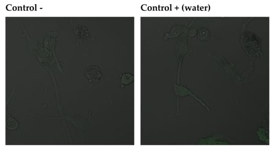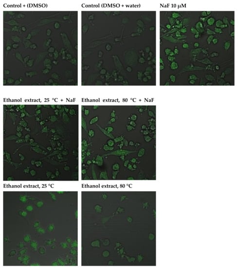 The addition of sodium fluoride at 10 µM to the culture resulted in a marked increase in green fluorescence, indicating the enhanced production of free radicals. Increased ROS synthesis was also noted in the control with DMSO and in the control with DMSO and distilled water. A slight increase in the production of free radicals in the cytoplasm was observed after adding plant extracts to the cell culture. Compared to the culture with fluoride or DMSO, the increase in ROS generation was significantly smaller. Introduction into the cell culture of extracts with fluoride led to an increase in the production of free radicals, but it was significantly smaller compared to adding the factor inducing free radical reactions on its own; hence, the extracts were observed to produce an antioxidant effect (Figure 3).