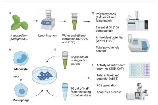Leaves of goutweed (Aegopodium podagraria L.) gathered before flowering in June from green areas (53°28′11.002″ N, 14°29′46.7982″ E) served as the study material for this research. The harvested plant (2 kg) was assessed by a botanist. The collected leaves underwent lyophilisation in a lyophilisator (0.735 mmHg/−20 °C; Alpha 1-2 LD plus) and were then subjected to homogenisation by grinding to a powder in a food homogeniser (FOSS 2094). The steps of the study are presented in Figure 5.