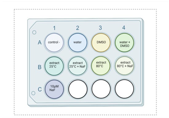 The monocytic cells, THP-1 line of the American Type Collection (ATCC, Rockville, MD, USA), cultivated on 6-well plates (2 × 106 cells), were differentiated into macrophages by adding 10 µL of phorbol ester (PMA, 100 nM) to the culture medium RPMI (Wytwórnia Szczepionek i Surowic, Lublin, Poland) that included 10% of the foetal bovine serum (FBS) (Gibco, Paisley, UK), penicillin (100 U/mL), and streptomycin (100 mg/mL) (Sigma—Aldrich, Poznań, Poland). The cells were incubated in standard conditions (37 °C and 5% CO2) for 24 h. Next, the adherent macrophages were washed three times with PBS. The cells were incubated for 48 h with the factors: NaF at a concentration of 10 μM, causing oxidative stress [16] and/or extracts of goutweed with a final concentration of 100 mg/mL [16,17,18,19,20,21,22,23,24,25,26,27,28,29,30,31,32]. Plant extracts were dissolved in DMSO at a concentration not exceeding 1%. Two extracts with the highest antioxidant potential obtained in spectrophotometric studies were selected for in vitro tests. The positive control for fluorine was distilled water, for the extracts from the plant, it was DMSO, while for both variants introduced to the culture, it was simultaneously water and DMSO. The concentrations of the added fluorides were chosen based on the results of human serum studies carried out by other authors. After 48 h of incubation, the cells were scrapped and centrifuged, and the resulting cell pellets were used in spectrophotometric measurements. The experiment was repeated 5 times. Protein concentration was measured using the Micro BCA Protein Kit (Thermo Fisher Scientific, Waltham, MA, USA).