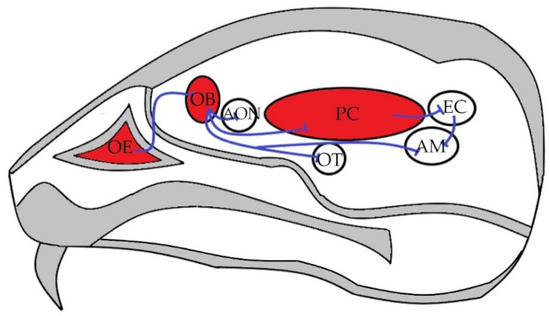 The olfactory tract is one of the oldest among the principal sensory systems allowing smell. Olfaction begins in the olfactory epithelium (OE) located in the nasal cavity [5]. Its sensory bipolar neurons (OSN) have a peripheral dendrite which is responsible for odour sensation, and a central axon transmitting the stimuli—via glomerular synapses—to the glutamatergic cells of the olfactory bulb (OB) [5,6,7]. Another important cell type in the OB is the GABAergic granule cell, interacting with the neurotransmission of glutamatergic neurones [7]. The axon bundles of the glutamatergic cells form the olfactory tract and terminate in primary and secondary olfactory areas (i.e., anterior olfactory nucleus (AON), olfactory tubercle (OT), piriform cortex (PC), amygdala (AM) and entorhinal cortex (EC)) [8] (Figure 1). The largest primary olfactory area is the PC, which, after processing, transmits information to the secondary olfactory and association brain areas. Besides the above detailed main olfactory tract, the accessory olfactory system also conveys signals to higher-order centres contributing to behavioral responses, such as social interaction, in several mammalian species [9].