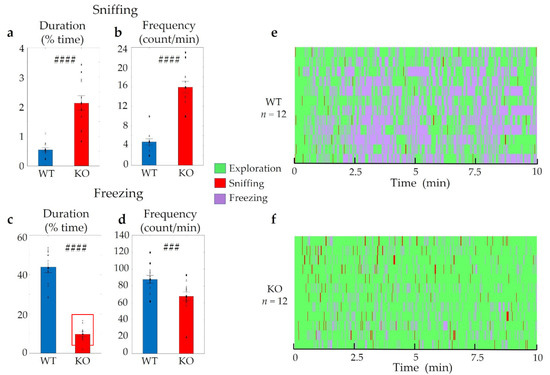 Behavioural differences in Trpa1 wild-type (WT) and knockout (KO) mice triggered by the fox odour, 2-MT. Remarkable differences were established in the duration and frequency of sniffing the odour holder (a,b) and freezing behaviour (c,d) between the two groups. The Gantt diagram presents the individual animals (e,f). n = 12 in both (WT and KO) groups, the symbol # shows a significant difference between the two genotypes, in cases with ### p < 0.001, and #### p < 0.0001. Blank triangles represent individual values while dark spots show outliers (characterized by a higher or lower value than mean ± 2 standard deviation (SD)).