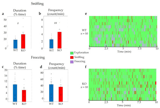 In the case of valeric acid, similar differences were observed between the genotypes in sniffing (tduration (2,19) = −3.27, p < 0.01; tfrequency (2,19) = −2.40, p < 0.03) (Figure 5a,b), while only a tendentious difference was observed for freezing (pfrequency > 0.50, pduration > 0.14) (Figure 5c,d). During this experiment, we investigated the temporal alterations of the frequency and duration of sniffing and found that KO animals sniffed the filter paper more often (Fgenotype (1,18) = 4.44, p < 0.05; Finteraction (9,162) = 2.11, p < 0.04) and for a longer time (Fgenotype (1,18) = 9.29, p < 0.01; Finteraction (9,162) = 1.96, p < 0.05) predominantly at the beginning and end of the examination (p2fr < 0.04, p5fr < 0.01, p7fr < 0.03, p8fr < 0.05 and p2dur < 0.03, p5dur < 0.01, p7dur < 0.01, p8dur < 0.01, p10dur < 0.04) compared to their WT mates (Figure 5e,f). However, neither in the case of frequency nor duration, was any significant effect of time detectable (Ftime frequency (9,162) = 0.49, p > 0.88; Ftime duration (9,162) = 1.02, p > 0.42).