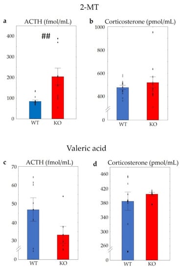 Serum adrenocorticotropin (ACTH) and corticosterone levels of WT and KO mice after using 2-MT or valeric acid. Applying 2-MT, KO mice showed significantly higher ACTH levels than WTs (a), without significant differences in the corticosterone levels (b). Using valeric acid, no differences in either ACTH (c) or in corticosterone levels (d) were detectable. The symbol # shows a significant difference between the two genotypes, in cases with ## p < 0.01. n = 10 in both (WT and KO) groups. Blank triangles represent individual values while dark spots show outliers (characterized by a higher or lower value than mean ± 2 standard deviation (SD)).